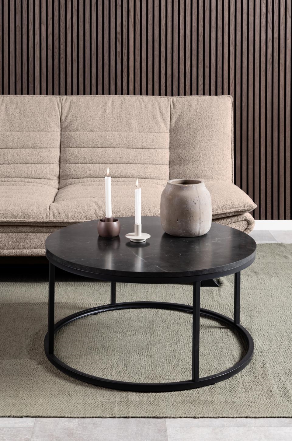 Spiro sofabord kombinerer moderne æstetik og eksklusivt design i et tidløst udtryk. Bordpladen er fremstillet i sort marmor Izmir melamin, som giver et autentisk marmorlook med en stilfuld, mat ru finish. Det slanke mat sorte ru pulverlakerede stålstel tilfører en moderne kontrast og sikrer en robust konstruktion. Med en diameter på 80 cm og en højde på 40 cm er bordet perfekt som midtpunkt i stuen eller loungen.