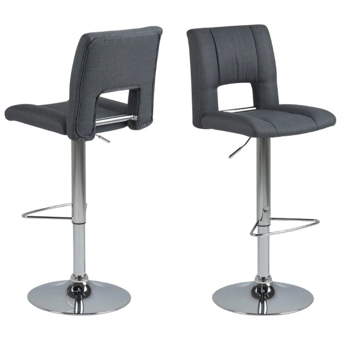 Sylvia Barstol er designet med fokus på både æstetik og komfort. Stolen er beklædt med Corsica stof i en mørkegrå nuance, som giver et elegant og moderne udtryk. Stellet er fremstillet i krom stål med et karakteristisk trompetdesign, der sikrer robusthed og stabilitet. Den integrerede drejefunktion med gaspatron muliggør nem justering af højden, og praktiske detaljer som håndtag og lodret syning tilføjer et unikt præg.