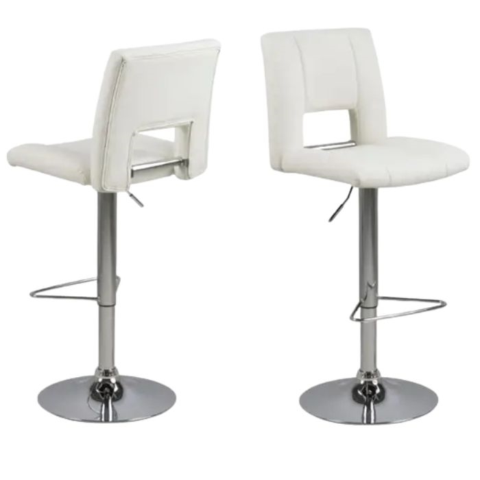 Med sit minimalistiske og moderne design passer Sylvia Barstol perfekt ind i enhver indretning. Den hvide PU-polstring og det elegante krom stålstel skaber et friskt og tidløst look, der tilfører ethvert rum et strejf af moderne elegance.