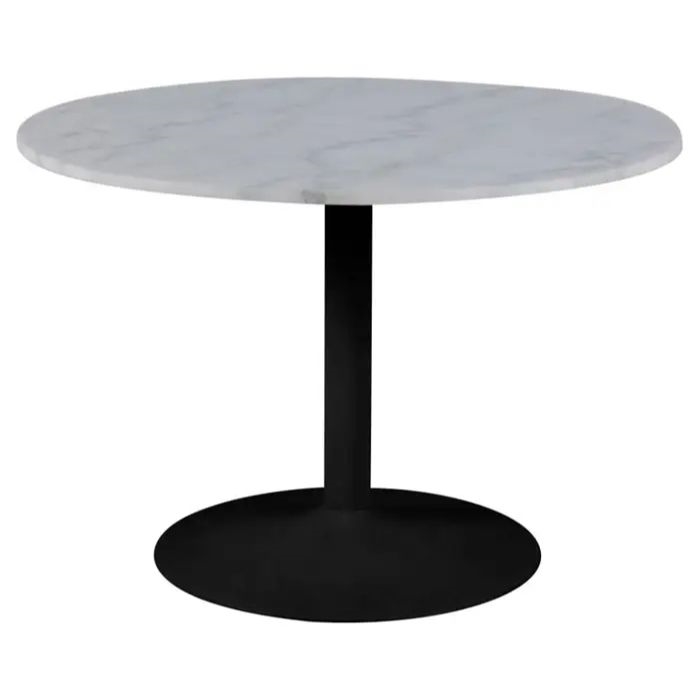 Tarifa Rund Spisebord er et elegant møbel, der kombinerer luksuriøse materialer med et moderne design. Bordpladen er fremstillet i hvid Guangxi poleret marmor, som udstråler renhed og tidløs skønhed, mens stellet er udført i mat sort pulverlakeret stål med et karakteristisk trompetdesign. Med dimensionerne Ø110 cm i diameter og 75 cm i højde er dette spisebord et ideelt valg til moderne spisestuer og caféområder.