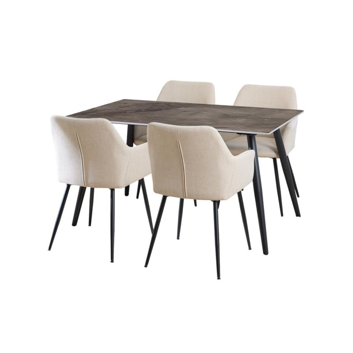 Wicklow spisebordssæt 140x80 cm med 4 stole i grå keramik og beige stof er en stilren og moderne løsning til din spiseplads. Kombinationen af eksklusive materialer og et komplet sæt gør det nemt at skabe en indbydende og funktionel indretning.
